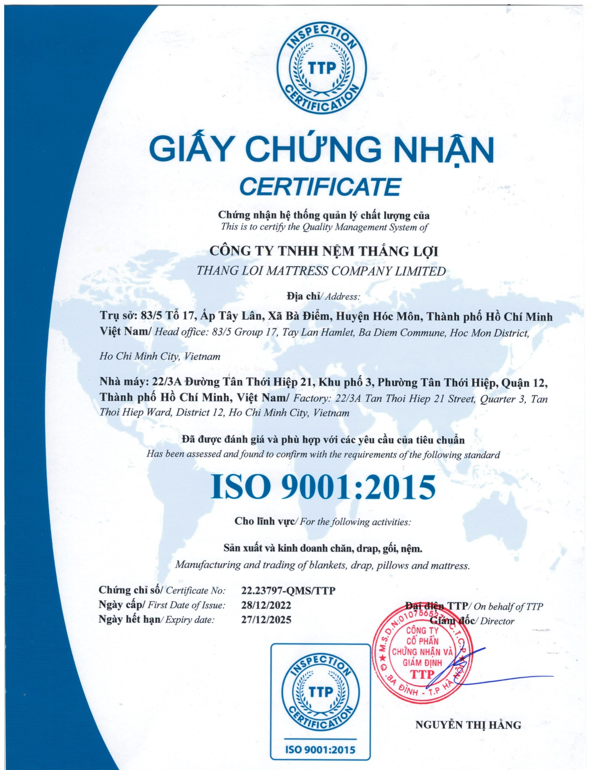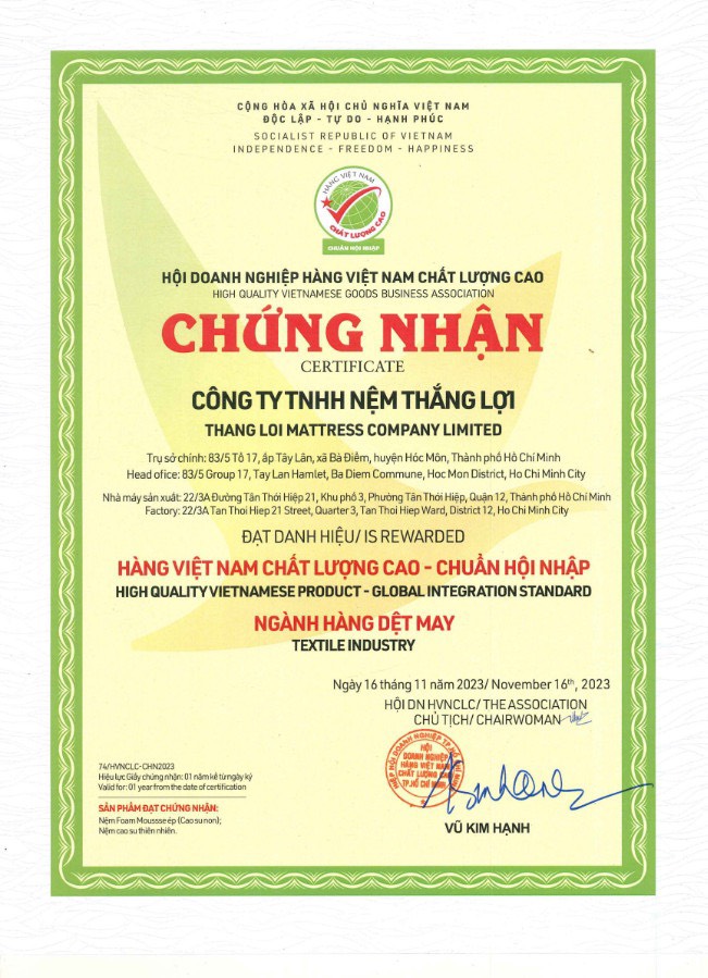 Công ty Nệm Thắng Lợi là một thương hiệu uy tín và lâu đời trong ngành sản xuất và kinh doanh các sản phẩm chăn ga gối nệm tại Việt Nam. Với cam kết về chất lượng và sự đổi mới không ngừng, Nệm Thắng Lợi đã khẳng định vị thế của mình qua việc cung cấp các sản phẩm chất lượng cao, đáp ứng nhu cầu đa dạng của người tiêu dùng. Nệm Thắng Lợi đã chiếm trọn niềm tin của người tiêu dùng qua nhiều năm hoạt động.